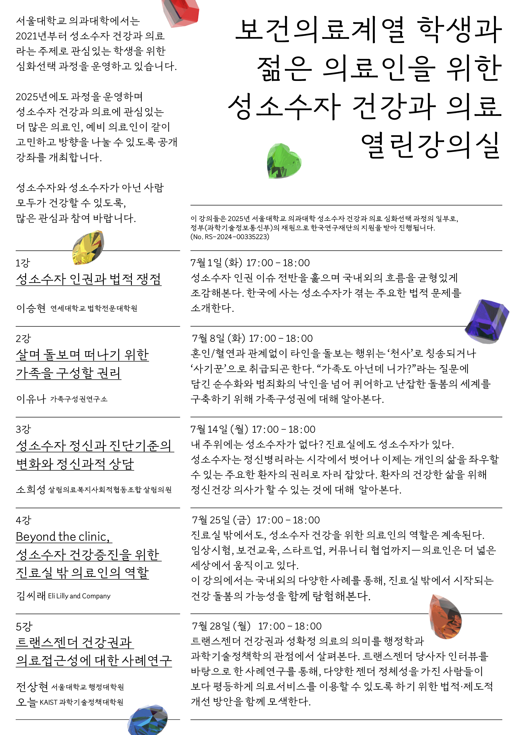 서울대학교 의과대학에서는 2021년부터‘성소수자 건강과 의료’라는 주제로 심화선택과정을 운영 중입니다.